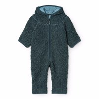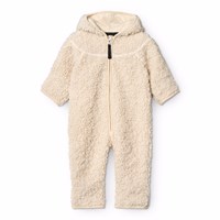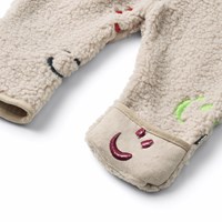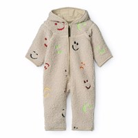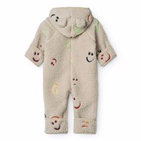 Beige fleecedragt til de mindste i genanvendt polyester med boderet smilende ansigter i forskellige farver og blødt bomulds foer. Dragten har praktisk lynlåslukning, hætte med påsyede små bamseører, matchende ribkanter og kan bruges alene eller som et ekstra lag under flyverdragten.