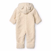 Råhvid fleecedragt til de mindste i genanvendt polyester med blødt bomulds foer. Dragten har praktisk lynlåslukning, hætte med påsyede små bamseører, matchende ribkanter og kan bruges alene eller som et ekstra lag under flyverdragten.