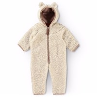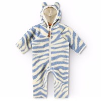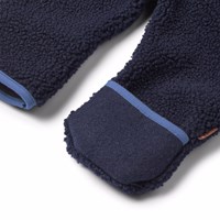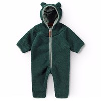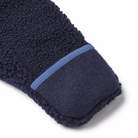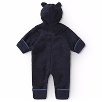 Mørkeblå fleecedragt til den mindste. Dragten har praktisk lynlåslukning, hætte med påsyede små bamseører og lyseblå kanter. Fleecedragten virker isolerende, og kan derfor bruges alene eller som et ekstra lag under flyverdragten på de koldeste dage.