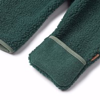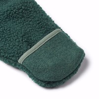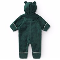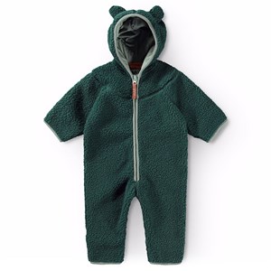 Mørkegrøn fleecedragt til den mindste. Dragten har praktisk lynlåslukning, hætte med påsyede små bamseører og lysegrønne kanter. Fleecedragten virker isolerende, og kan derfor bruges alene eller som et ekstra lag under flyverdragten på de koldeste dage.