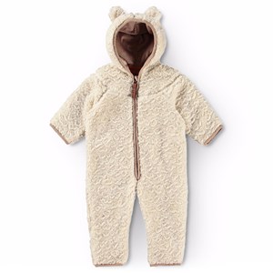 Råhvid fleecedragt til den mindste. Dragten har praktisk lynlåslukning, hætte med påsyede små bamseører og beige kanter. Fleecedragten virker isolerende, og kan derfor bruges alene eller som et ekstra lag under flyverdragten på de koldeste dage.