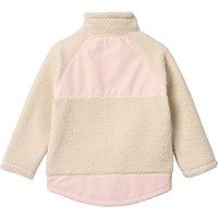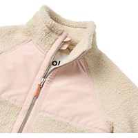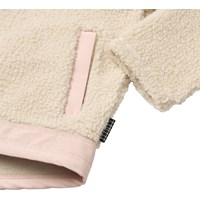 Råhvid og lyserød fleecejakke i genanvendt polyester med frontlommer og slidstærke detaljer. Jakken har en løs pasform, høj krave, lynlåslukning med hagebeskytter og går længere ned bagpå.