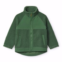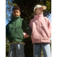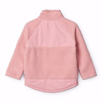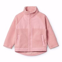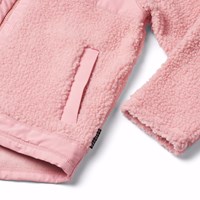 Lyserød fleecejakke i genanvendt polyester med frontlommer og slidstærke detaljer. Jakken har en løs pasform, høj krave, lynlåslukning med hagebeskytter og går længere ned bagpå.