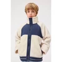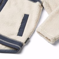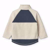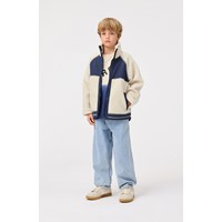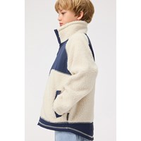 Råhvid fleecejakke i genanvendt polyester med frontlommer og blå slidstærke detaljer. Jakken har en løs pasform, høj krave, lynlåslukning med hagebeskytter og går længere ned bagpå.