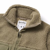 Mørkegrøn fleecejakke i genanvendt polyester med detaljer på ærmer, ryggen samt udvendige frontlommer i vind og vandafvisende slidstærkt nylon. Jakken har en høj krave og lynlåslukning på fronten.