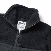 Sort fleecejakke i genanvendt polyester med detaljer på ærmer, ryggen samt udvendige frontlommer i vind og vandafvisende slidstærkt nylon. Jakken har en høj krave og lynlåslukning på fronten.