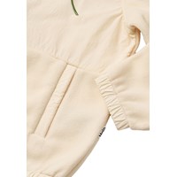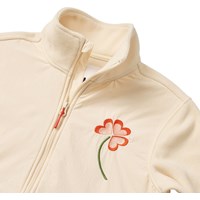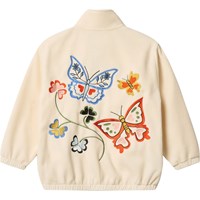 Råhvid fleecejakke med blød bund og glat, vind- og vandafvisende stof foroven. Jakken har lynlås med rød detalje, høj krave, elastik ved ærmer og kant samt lommer i siden. Foran er der et lille blomsterbroderi, og bagpå et farverigt motiv med sommerfugle. En varm og behagelig jakke til hverdag.