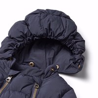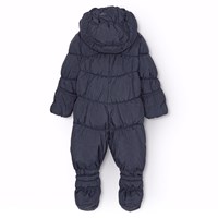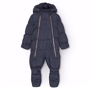 Vandafvisende mørkeblå babydragt i genanvendt polyester. Dragten er velegnet som barnevognsdragt til de koldere dage. Dragten er udstyret med to lynlåse på fronten der gør den nem at komme af og i, en aftagelig hætte samt små aftagelige fødder der nemt klikkes af og på med knapper. Dragten har fleece foer, elastik i ærme- og benåbning der holder fast på vanter, sokker og støvler samt beskytter mod vind og vejr.