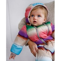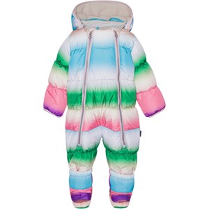 Varm og blød baby flyverdragt eller barnevognsdragt i pastel farvet regnbue print. Flyverdragten er en del af Molo’s 'Everyday Exploration’, som er overtøj til hverdagens mange eventyr og som samtidig skiller sig ud med flotte detaljer eller farver. Dragten er selvfølgelig også produceret ved brug af ansvarlige og genanvendte materialer og lever derved op til Molo’s høje standarder for overtøj.