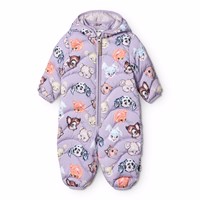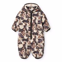 Lilla vandafvisende quiltet dragt i genanvendt polyester til de mindste, med lyst foer, brune kanter og print af farverige dyr fra gamle tegnefilm. Dragten har en aftagelig hætte, opretstående krave, lang lynlås med hagebeskytter der gør den nem at komme af og i. Ydemere har dragten et genanvendt polyesterfyld, der giver jævn blødhed og optimal varmeisolering samt den vandafvisende overflade er fri for PFOS og PFOA.