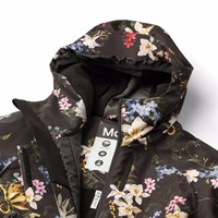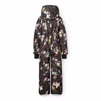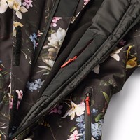 Sort vind- og vandtæt flyverdragt i et farverigt blomsterprint til en kold vinter eller skiferien i genanvendt polyester. Dragten har en aftagelig foret hætte med en ekstra elestikkant der holder den fast på hovedet samt en lynlås på fronten med overfald, der holder vind og vand ude. Flyverdragten har elastik i lænden samt vind og snefang ved ærmer og benåbning, så sne, regn og vind holdes ude. Derudover indeholder dragten en ekstra justering ved benåbningen og anvender et slidstærkt materiale på indersiden. Dette sikrer, at dragten sidder perfekt over skistøvler eller vinterstøvler og samtidig forlænger levetiden. Dragten er udstyret med en refleks tekst på benet, som sikrer synlighed i trafikken. Ydemere er dragten foret med genanvendt polyesterfleece udsatte steder samt vatteret med 3M™ Thinsulate™, som hjælper med at holde på varmen. Dragten har frontlommer, inderlomme, og en lille lomme på ærmet til et liftkort alle med vandtætte lynlåse.