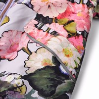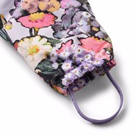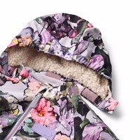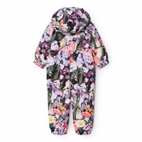Vandafvisende blomstret flyverdragt til de mindste, fremstillet i genanvendt polyester. Dragten har en aftagelig, foret hætte og en ekstra lang lynlås på fronten, der gør den nem at tage på og af. Elastikken i lænden samt ved ærme- og benafslutninger sørger for, at sne, regn og vind holdes ude, samtidig med at luffer og støvler bliver på plads. Flyverdragten er udstyret med refleksbånd på lommerne og ærmerne, som sikrer ekstra synlighed i trafikken. Derudover har dragten fleecefor ved numse og ryg samt indvendig justerbar elastik i taljen, der giver en tæt og behagelig pasform omkring kroppen.