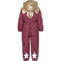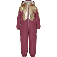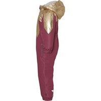 Peony er en bordeaux flyverdragt med påsyet guld krave som går ned over skuldrene og ligner blomsterblade. Flyverdragten er lavet i recycled polyester. Dette produkt har en vandafvisende PFC-fri imprægnering (indeholder f.eks. ikke PFOS, PFOA og lignende). Vandsøjletryk: 10.000 mm. Åndbarhed: 10.000 g/m2/24t.