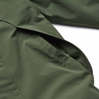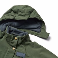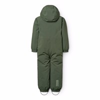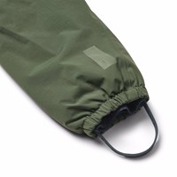Vandafvisende mørkegrøn flyverdragt, fremstillet i genanvendt nylon. Dragten har en aftagelig foret hætte og en lang lynlås på fronten med overfald der gør den nem at tage af og på. Elastikken i lænden samt ved ærme- og benafslutninger sørger for, at sne, regn og vind holdes ude, samtidig med at luffer og støvler bliver på plads. Flyverdragten er udstyret med en refleks på benet, som sikrer ekstra synlighed i trafikken. Derudover har dragten en indvendig justerbar elastik i taljen, der giver en tæt og behagelig pasform omkring kroppen.