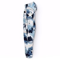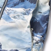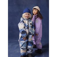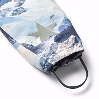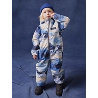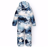 Flyverdragt til en kold vinter i genanvendt polyester, i et vinterlandskabsprint i blå nuancer. Dragten har en aftagelig foret hætte, vandtæt lynlås på fronten, der holder vind og vand ude. Flyverdragten har elastik i lænden, ved ærme- og ben afslutning, så sne, regn og vind holdes ude, samt holder på luffer og støvler. Dragten er udstyret med refleksbånd langs sidesømmene samt store stjerneformede reflekser på både ærmer, ben og ryggen, som sikrer synlighed i trafikken. Dragten har foret sidelommer og en indvendig justerbar elastik i taljen som giver form og tæthed omkring kroppen.