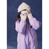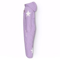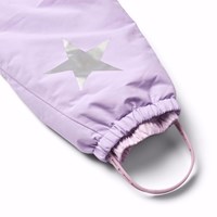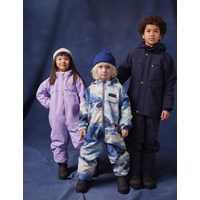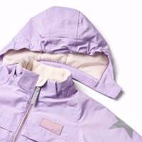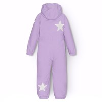 Lilla flyverdragt til en kold vinter i genanvendt polyester. Dragten har en aftagelig foret hætte, vandtæt lynlås på fronten, der holder vind og vand ude. Flyverdragten har elastik i lænden, ved ærme- og ben afslutning, så sne, regn og vind holdes ude, samt holder på luffer og støvler. Dragten er udstyret med refleksbånd langs sidesømmene samt store stjerneformede reflekser på både ærmer, ben og ryggen, som sikrer synlighed i trafikken. Dragten har foret sidelommer og en indvendig justerbar elastik i taljen som giver form og tæthed omkring kroppen.