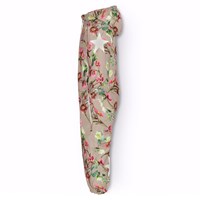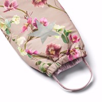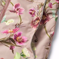 Flyverdragt til en kold vinter i genanvendt polyester, med et print af juleroser i hvide og lyserøde nuancer, som grener sig flot sammen i deres grønne blade på en mokkafarvet baggrund. Dragten har en aftagelig foret hætte, vandtæt lynlås på fronten, der holder vind og vand ude. Flyverdragten har elastik i lænden, ved ærme- og ben afslutning, så sne, regn og vind holdes ude, samt holder på luffer og støvler. Dragten er udstyret med refleksbånd langs sidesømmene samt store stjerneformede reflekser på både ærmer, ben og ryggen, som sikrer synlighed i trafikken. Dragten har foret sidelommer og en indvendig justerbar elastik i taljen som giver form og tæthed omkring kroppen.