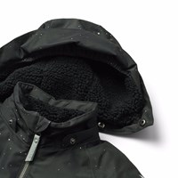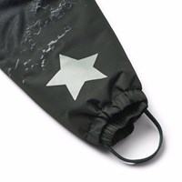 Vandafvisende flyverdragt med et print af manden på månen fremstillet i genanvendt polyester. Dragten har lynlåslommer, en aftagelig foret hætte med vindfang samt en lang lynlås på fronten der gør den nem at tage af og på. Elastikken ved ærme- og benafslutninger sørger for, at sne, regn og vind holdes ude, samtidig med at luffer og støvler bliver på plads. Flyverdragten er udstyret med en stjerne refleks på benet, som sikrer ekstra synlighed i trafikken samt den indvendig justerbar elastik i taljen, giver en tæt og behagelig pasform omkring kroppen.