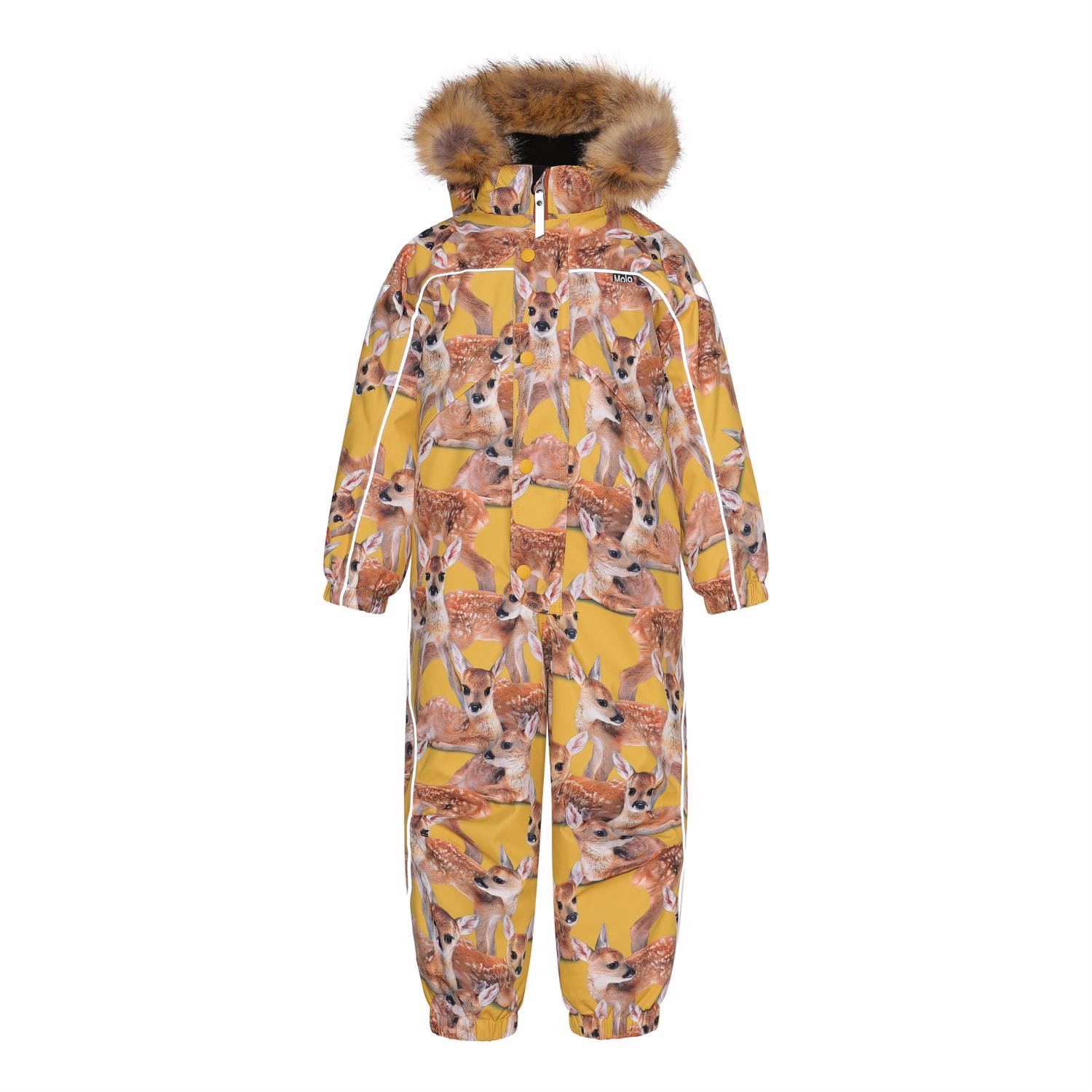 Polaris Fur er en af Molo's favoritter, når det er rigtig koldt. Polaris er foruden dens mange velkendte kvaliteter nu også delvist recycled. Det betyder at ydermaterialet er 51% recycled, mens foret og indermaterialer er 100% recycled og fremstillet af genanvendt polyester. Polaris er en funktionel flyverdragt i gul med print af rådyr. Flyverdragten har desuden refleks pipings og en faux fur pels krave (kan tages af). Polaris har aftagelig hætte, lynlås ned langs fronten med overfald, Molo's velkendte stjernereflekser på arme og ben, snefang i benåbning, samt gummistrop under foden. Flyverdragten er lavet i et vindtæt, vandtæt og åndbart materialeog har tapede sømme. Dette produkt har en vandafvisende PFC-fri imprægnering (indeholder f.eks. ikke PFOS, PFOA og lignende) og har på baggrund af dette vundet 'Bedst-i-Test' . Vandsøjletrykket og åndbarheden er yderligere forbedret og er nu helt oppe på 15.000 mm i vandsøjletryk og åndbarhed på 15.000 g/m2/24t.