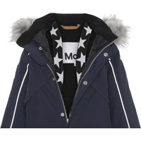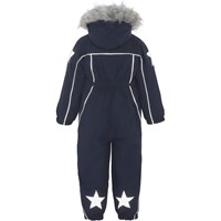 Polaris Fur er en af Molo's favoritter, når det er rigtig koldt. Polaris er en funktionel flyverdragt i blå. Polaris er perfekt både til de ekstrem kolde og almindelige vintre, grundet dets utrolig høje åndbarhed samt isolering. Den høje åndbarhed er med til at hjælpe kropstemperaturen regulere sig og sørge for, at dit barn hverken bliver for kold eller varm. På varmere vinterdage kan barnet derfor nøjes med tynde lag under og på dage med voldsomme tocifrede minusgrader kan man supplere med et ekstra lag indenunder. Har du er stillesiddende barn vil Polaris også være et oplagt valg. Flyverdragten har desuden refleks pipings og en faux furpels krave (kan tages af). Polaris har aftagelig hætte, lynlås ned langs fronten med overfald, Molo's velkendte stjernereflekser på arme og ben, snefang i benåbning, samt gummistrop under foden. Polaris er foruden dens mange velkendte kvaliteter nu også delvist recycled. Ydermaterialet er fremstillet af 59% recycled nylon, 3M™ Thinsulate™ foret er fremstillet af 83% recycled polyester og inderstoffet af 100% recycled polyester. Flyverdragten er lavet i et vindtæt, vandtæt og åndbart materiale og har tapede sømme. Dette produkt har en vandafvisende PFC-fri imprægnering (indeholder f.eks. ikke PFOS, PFOA og lignende) og har på baggrund af dette vundet 'Bedst-i-Test'. Vandsøjletrykket og åndbarheden er yderligere forbedret og er nu helt oppe på 15.000 mm i vandsøjletryk og åndbarhed på 15.000 g/m2/24t.