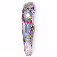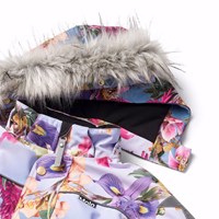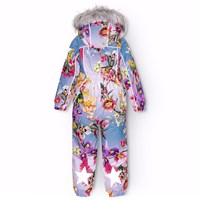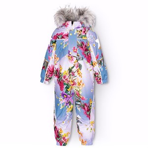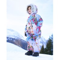 Flyverdragt til en kold vinter i genanvendt polyester, med et print af smukke blomster i friske farver på en blå og lilla baggrund. Dragten har en aftagelig foret hætte, lynlås med overfald, der holder vind og vand ude. Flyverdragten har elastik i lænden, ved ærme- og ben afslutning, så sne, regn og vind holdes ude. Dragten er udstyret med refleksbånd langs sidesømmene, rundt om hætten, samt store stjerneformede reflekser på både ærmer og ben, som sikrer synlighed i trafikken. Dragten er foret med 3M™ Thinsulate™, hvis lethed giver barnet en større bevægelighed samt foret frontlommer med vandtætte lynlåse.