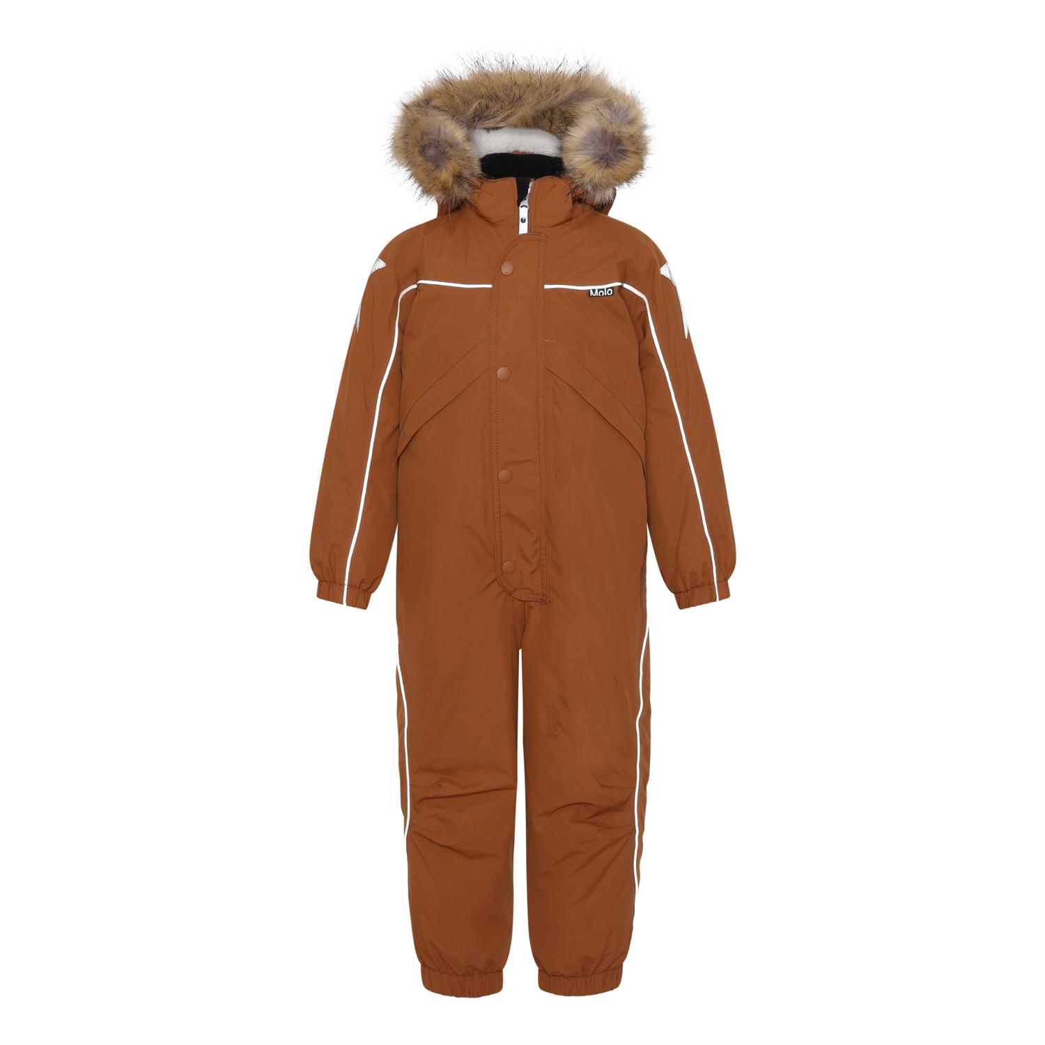 Polaris Fur er en af Molo's favoritter, når det er rigtig koldt. Polaris er foruden dens mange velkendte kvaliteter nu også delvist recycled. Det betyder at ydermaterialet er 51% recycled, mens foret og indermaterialer er 100% recycled og fremstillet af genanvendt polyester. Flyverdragten er i brun med refleks pipings og en faux fur pels krave (kan tages af). Polaris har aftagelig hætte, lynlås ned langs fronten med overfald, Molo's velkendte stjernereflekser på arme og ben, snefang i benåbning, samt gummistrop under foden. Flyverdragten er lavet i et vindtæt, vandtæt og åndbart materialeog har tapede sømme. Dette produkt har en vandafvisende PFC-fri imprægnering (indeholder f.eks. ikke PFOS, PFOA og lignende) og har på baggrund af dette vundet 'Bedst-i-Test' . Vandsøjletrykket og åndbarheden er yderligere forbedret og er nu helt oppe på 15.000 mm i vandsøjletryk og åndbarhed på 15.000 g/m2/24t.