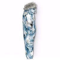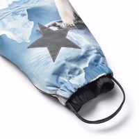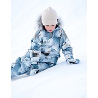 Flyverdragt til en kold vinter i genanvendt polyester, med et print af legende isbjørne imellem isflager i blå nuancer. Dragten har en aftagelig foret hætte, lynlåse med overfald, der holder vind og vand ude. Flyverdragten har elastik i lænden, ved ærme- og ben afslutning, så sne, regn og vind holdes ude. Dragten er udstyret med refleksbånd langs sidesømmene, rundt om hætten, samt store stjerneformede reflekser på både ærmer og ben, som sikrer synlighed i trafikken. Dragten har frontlommer med vandtætte lynlåse.Dragten er foret med 3M™ Thinsulate™, hvis lethed giver barnet en større bevægelighed. Dragten har frontlommer med vandtætte lynlåse.