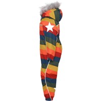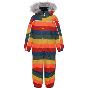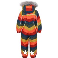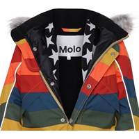 Polaris Fur er en af Molo's favoritter, når det er rigtig koldt. Polaris er foruden dens mange velkendte kvaliteter nu også delvist recycled. Det betyder at ydermaterialet er 51% recycled, mens foret og indermaterialer er 100% recycled og fremstillet af genanvendt polyester. Polaris er en funktionel flyverdragt i regnbur print. Flyverdragten har desuden refleks pipings og en faux fur pels krave (kan tages af). Polaris har aftagelig hætte, lynlås ned langs fronten med overfald, Molo's velkendte stjernereflekser på arme og ben, snefang i benåbning, samt gummistrop under foden. Flyverdragten er lavet i et vindtæt, vandtæt og åndbart materialeog har tapede sømme. Dette produkt har en vandafvisende PFC-fri imprægnering (indeholder f.eks. ikke PFOS, PFOA og lignende) og har på baggrund af dette vundet 'Bedst-i-Test' . Vandsøjletrykket og åndbarheden er yderligere forbedret og er nu helt oppe på 15.000 mm i vandsøjletryk og åndbarhed på 15.000 g/m2/24t.