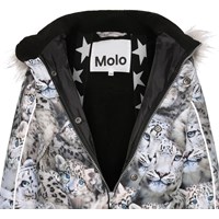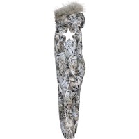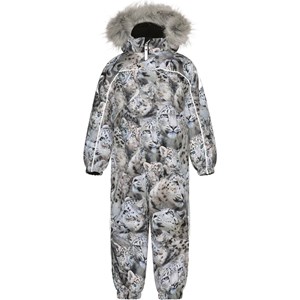 Polaris Fur er en af Molo's favoritter, når det er rigtig koldt. Polaris er foruden dens mange velkendte kvaliteter nu også delvist recycled. Det betyder at ydermaterialet er 51% recycled, mens foret og indermaterialer er 100% recycled og fremstillet af genanvendt polyester. Polaris er en funktionel flyverdragt i grå med print af sneleoparder. Flyverdragten har desuden refleks pipings og en faux fur pels krave (kan tages af). Polaris har aftagelig hætte, lynlås ned langs fronten med overfald, Molo's velkendte stjernereflekser på arme og ben, snefang i benåbning, samt gummistrop under foden. Flyverdragten er lavet i et vindtæt, vandtæt og åndbart materialeog har tapede sømme. Dette produkt har en vandafvisende PFC-fri imprægnering (indeholder f.eks. ikke PFOS, PFOA og lignende) og har på baggrund af dette vundet 'Bedst-i-Test' . Vandsøjletrykket og åndbarheden er yderligere forbedret og er nu helt oppe på 15.000 mm i vandsøjletryk og åndbarhed på 15.000 g/m2/24t.