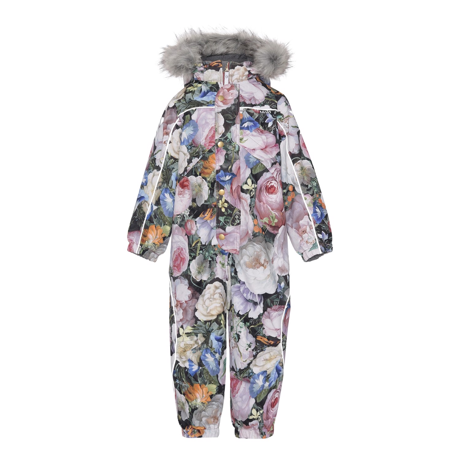 Polaris Fur er en af Molo's favoritter, når det er rigtig koldt. Polaris er en funktionel flyverdragt med print af store blomster. Polaris er perfekt både til de ekstrem kolde og almindelige vintre, grundet dets utrolig høje åndbarhed samt isolering. Den høje åndbarhed er med til at hjælpe kropstemperaturen regulere sig og sørge for, at dit barn hverken bliver for kold eller varm. På varmere vinterdage kan barnet derfor nøjes med tynde lag under og på dage med voldsomme tocifrede minusgrader kan man supplere med et ekstra lag indenunder. Har du er stillesiddende barn vil Polaris også være et oplagt valg. Flyverdragten har desuden refleks pipings og en faux furpels krave (kan tages af). Polaris har aftagelig hætte, lynlås ned langs fronten med overfald, Molo's velkendte stjernereflekser på arme og ben, snefang i benåbning, samt gummistrop under foden. Polaris er foruden dens mange velkendte kvaliteter nu også delvist recycled. Ydermaterialet er fremstillet af 45% recycled polyester, 3M™ Thinsulate™ foret er fremstillet af 83% recycled polyester og inderstoffet af 100% recycled polyester. Flyverdragten er lavet i et vindtæt, vandtæt og åndbart materiale og har tapede sømme. Dette produkt har en vandafvisende PFC-fri imprægnering (indeholder f.eks. ikke PFOS, PFOA og lignende) og har på baggrund af dette vundet 'Bedst-i-Test'. Vandsøjletrykket og åndbarheden er yderligere forbedret og er nu helt oppe på 15.000 mm i vandsøjletryk og åndbarhed på 15.000 g/m2/24t.