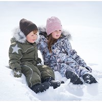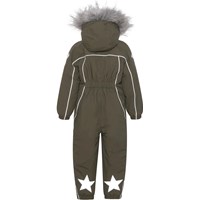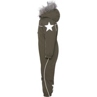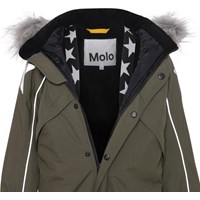 Polaris Fur er en af Molo's favoritter, når det er rigtig koldt. Polaris er foruden dens mange velkendte kvaliteter nu også delvist recycled. Det betyder at ydermaterialet er 51% recycled, mens foret og indermaterialer er 100% recycled og fremstillet af genanvendt polyester. Flyverdragten er i grøn med refleks pipings og en faux fur pels krave (kan tages af). Polaris har aftagelig hætte, lynlås ned langs fronten med overfald, Molo's velkendte stjernereflekser på arme og ben, snefang i benåbning, samt gummistrop under foden. Flyverdragten er lavet i et vindtæt, vandtæt og åndbart materialeog har tapede sømme. Dette produkt har en vandafvisende PFC-fri imprægnering (indeholder f.eks. ikke PFOS, PFOA og lignende) og har på baggrund af dette vundet 'Bedst-i-Test' . Vandsøjletrykket og åndbarheden er yderligere forbedret og er nu helt oppe på 15.000 mm i vandsøjletryk og åndbarhed på 15.000 g/m2/24t.
