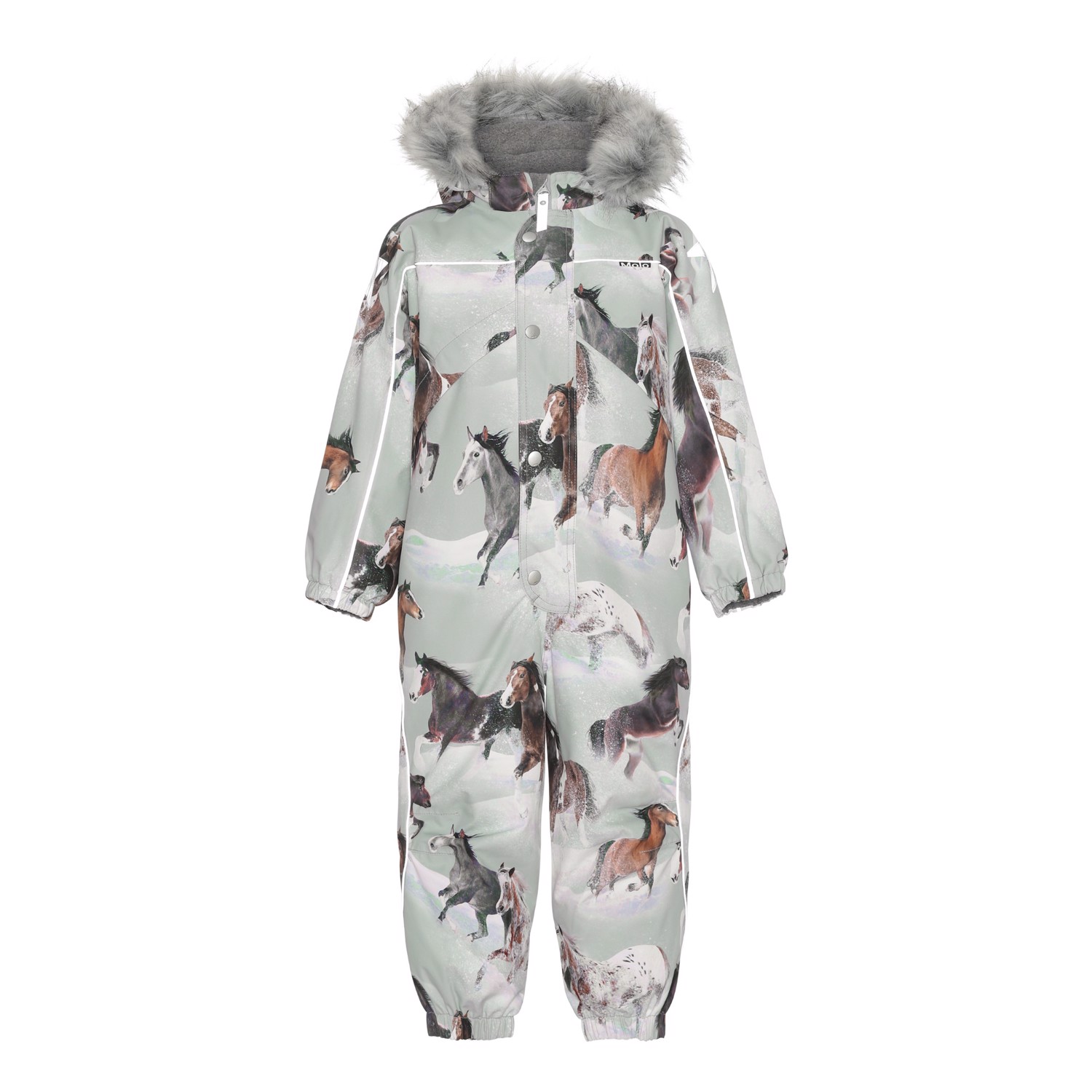 Polaris Fur er en af Molo's favoritter, når det er rigtig koldt. Polaris er en funktionel flyverdragt i lysegrå med heste print. Polaris er perfekt både til de ekstrem kolde og almindelige vintre, grundet dets utrolig høje åndbarhed samt isolering. Den høje åndbarhed er med til at hjælpe kropstemperaturen regulere sig og sørge for, at dit barn hverken bliver for kold eller varm. På varmere vinterdage kan barnet derfor nøjes med tynde lag under og på dage med voldsomme tocifrede minusgrader kan man supplere med et ekstra lag indenunder. Har du er stillesiddende barn vil Polaris også være et oplagt valg. Flyverdragten har desuden refleks pipings og en faux furpels krave (kan tages af). Polaris har aftagelig hætte, lynlås ned langs fronten med overfald, Molo's velkendte stjernereflekser på arme og ben, snefang i benåbning, samt gummistrop under foden. Polaris er foruden dens mange velkendte kvaliteter nu også delvist recycled. Ydermaterialet er fremstillet af 45% recycled polyester, 3M™ Thinsulate™ foret er fremstillet af 83% recycled polyester og inderstoffet af 100% recycled polyester. Flyverdragten er lavet i et vindtæt, vandtæt og åndbart materiale og har tapede sømme. Dette produkt har en vandafvisende PFC-fri imprægnering (indeholder f.eks. ikke PFOS, PFOA og lignende) og har på baggrund af dette vundet 'Bedst-i-Test'. Vandsøjletrykket og åndbarheden er yderligere forbedret og er nu helt oppe på 15.000 mm i vandsøjletryk og åndbarhed på 15.000 g/m2/24t.
