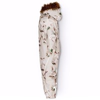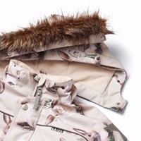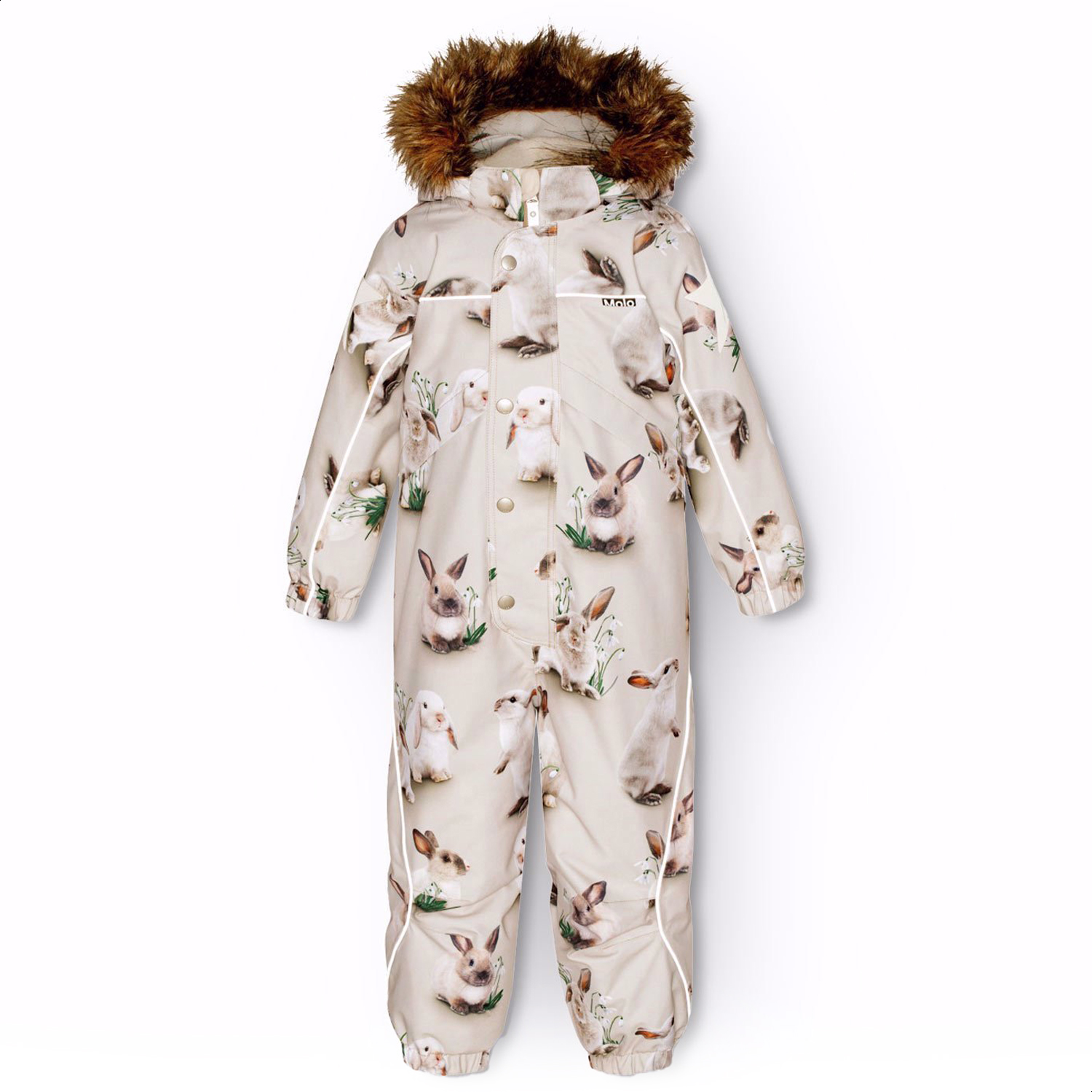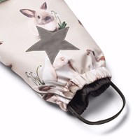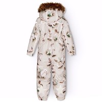 Flyverdragt til en kold vinter i genanvendt polyester, med et print af nuttede kaniner imellem vintergækker på en grå bagrund. Dragten har en aftagelig foret hætte, lynlås med overfald, der holder vind og vand ude. Flyverdragten har elastik i lænden, ved ærme- og ben afslutning, så sne, regn og vind holdes ude. Dragten er udstyret med refleksbånd langs sidesømmene, rundt om hætten, samt store stjerneformede reflekser på både ærmer og ben, som sikrer synlighed i trafikken. Dragten er foret med 3M™ Thinsulate™, hvis lethed giver barnet en større bevægelighed. Dragten har frontlommer med vandtætte lynlåse.Dragten er foret med 3M™ Thinsulate™, hvis lethed giver barnet en større bevægelighed. Dragten har frontlommer med vandtætte lynlåse.