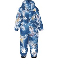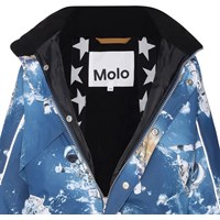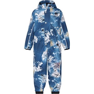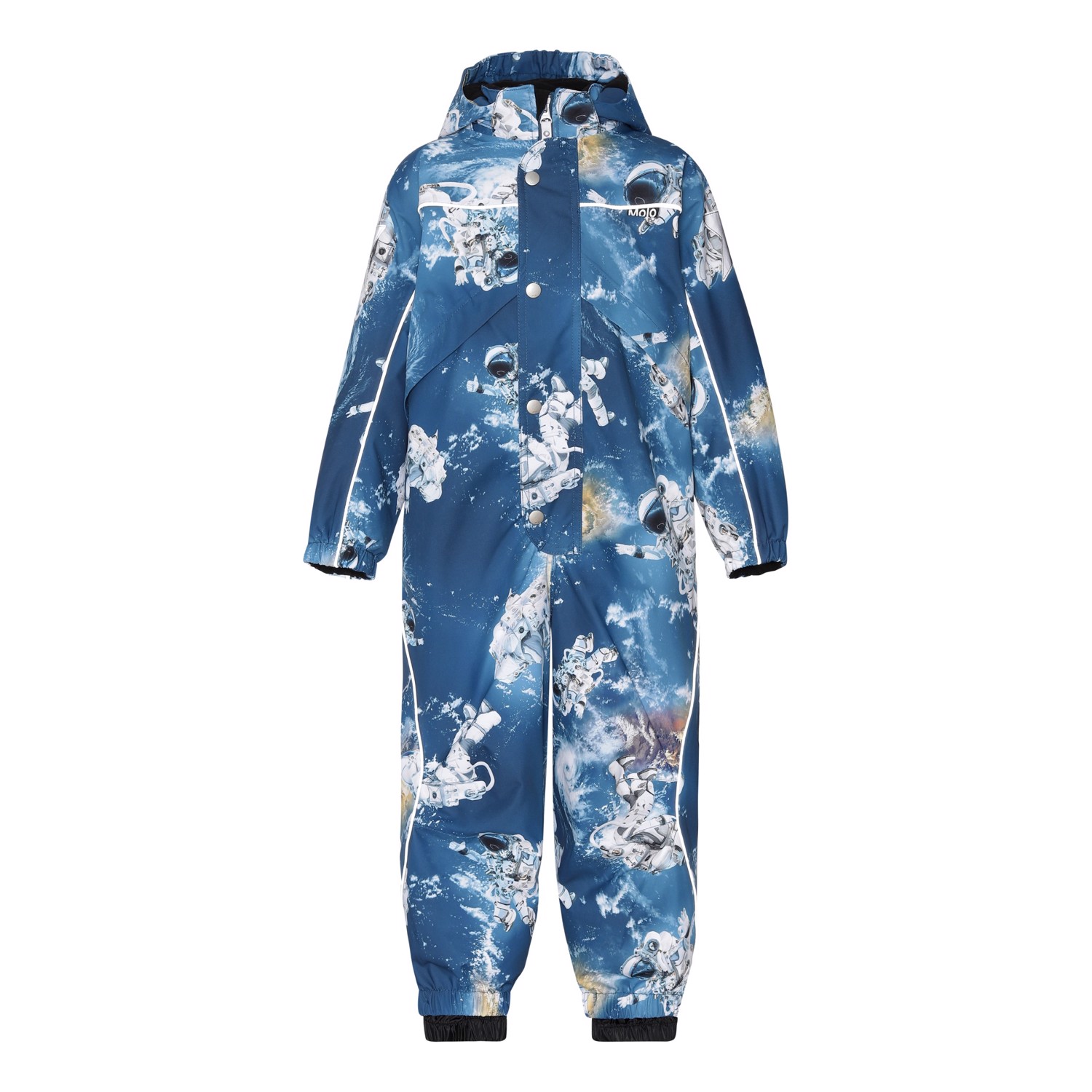 Polaris Fur er en af Molo's favoritter, når det er rigtig koldt. Polaris er en funktionel flyverdragt i blå med print af astronauter og refleks pipings. Polaris er perfekt både til de ekstrem kolde og almindelige vintre, grundet dets utrolig høje åndbarhed samt isolering. Den høje åndbarhed er med til at hjælpe kropstemperaturen regulere sig og sørge for, at dit barn hverken bliver for kold eller varm. På varmere vinterdage kan barnet derfor nøjes med tynde lag under og på dage med voldsomme tocifrede minusgrader kan man supplere med et ekstra lag indenunder. Har du er stillesiddende barn vil Polaris også være et oplagt valg. Flyverdragten har desuden refleks pipings og en faux furpels krave (kan tages af). Polaris har aftagelig hætte, lynlås ned langs fronten med overfald, Molo's velkendte stjernereflekser på arme og ben, snefang i benåbning, samt gummistrop under foden. Polaris er foruden dens mange velkendte kvaliteter nu også delvist recycled. Ydermaterialet er fremstillet af 45% recycled polyester, 3M™ Thinsulate™ foret er fremstillet af 83% recycled polyester og inderstoffet af 100% recycled polyester. Flyverdragten er lavet i et vindtæt, vandtæt og åndbart materiale og har tapede sømme. Dette produkt har en vandafvisende PFC-fri imprægnering (indeholder f.eks. ikke PFOS, PFOA og lignende) og har på baggrund af dette vundet 'Bedst-i-Test'. Vandsøjletrykket og åndbarheden er yderligere forbedret og er nu helt oppe på 15.000 mm i vandsøjletryk og åndbarhed på 15.000 g/m2/24t.
