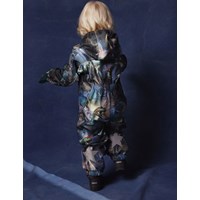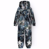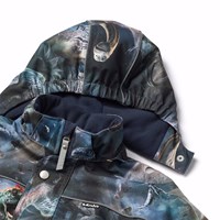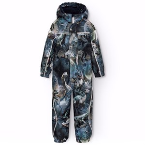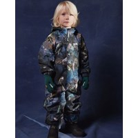 Flyverdragt til en kold vinter i genanvendt polyester, med et print af vilde dinosauer i rummet i mørkeblå og brune nuancer. Flyverdragten har en aftagelig foret hætte, lynlåse med overfald, der holder vind og vand ude. Flyverdragten har elastik i lænden, ved ærme- og ben afslutning, så sne, regn og vind holdes ude. Dragten er udstyret med refleksbånd langs sidesømmene, rundt om hætten, samt store stjerneformede reflekser på både ærmer og ben, som sikrer synlighed i trafikken. Dragten er foret med 3M™ Thinsulate™, hvis lethed giver barnet en større bevægelighed samt foret frontlommer med vandtætte lynlåse.