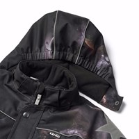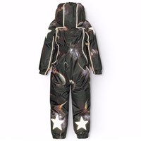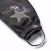 Sort flyverdragt til en kold vinter i genanvendt polyester, med et print af planeter og rummets flotte lys. Flyverdragten har en aftagelig foret hætte, lynlåse med overfald, der holder vind og vand ude. Flyverdragten har elastik i lænden, ved ærme- og ben afslutning, så sne, regn og vind holdes ude. Dragten er udstyret med refleksbånd langs sidesømmene, rundt om hætten, samt store stjerneformede reflekser på både ærmer og ben, som sikrer synlighed i trafikken. Dragten er foret med 3M™ Thinsulate™, hvis lethed giver barnet en større bevægelighed samt foret frontlommer med vandtætte lynlåse.