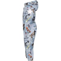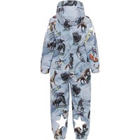 Funktionel flyverdragt, her i en let og uforet udgave med et print af sjove hunde, der skater. Flyverdragten er lavet i et ansvarligt materiale, eftersom den er fremstillet af 100% genanvendt polyester fra plastikflasker. Dragten har aftagelig hætte, lynlås ned langs fronten med overslag, der afskærmer for vind og vand, elastik i taljen bagpå, ved ærme- og benafslutning samt adskillelige reflekser. Dragten passer til det meste vejr, da selve materialet er vandtæt, åndbart og har tapede sømme. Dette produkt har en vandafvisende PFC-fri imprægnering (indeholder f.eks. ikke PFOS, PFOA og lignende). Vandsøjletryk: 5.000 mm. Åndbarhed: 5.000 g/m2/24t.