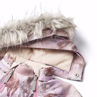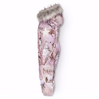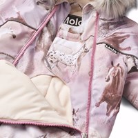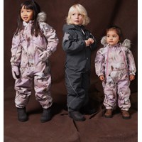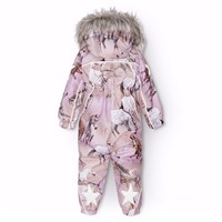 Flyverdragt til en kold vinter i genanvendt polyester, med et print af heste med en bagrund i lyserøde og lilla nuancer. Flyverdragten har en aftagelig hætte med fleece, to lynlåse med fleeceforet hagebeskytter for at undgå huden kommer i klemme. Flyverdragten har indvendig vindstolpe samt elastik i lænden, ved ærme- og ben afslutning, så sne, regn og vind holdes ude. Dragten er udstyret med refleksbånd langs sidesømmene, rundt om hætten, samt store stjerneformede reflekser på både ærmer og ben, som sikrer synlighed i trafikken. Dragten er foret med 3M™ Thinsulate™, hvis lethed giver barnet en større bevægelighed.
