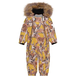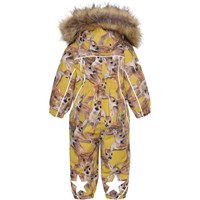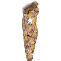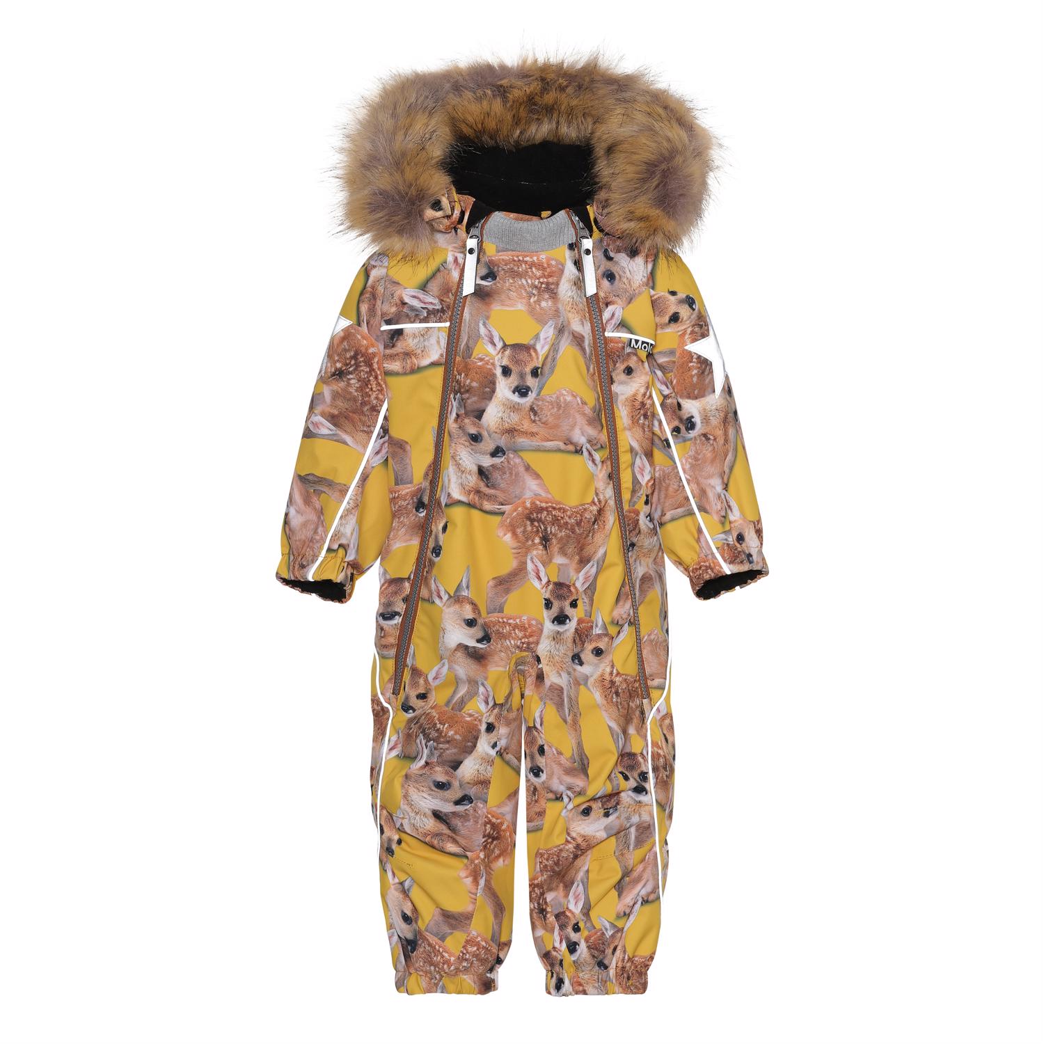 Pyxis er en funktionel flyverdragt til babyer og små børn i gul med print af små hjorte. Flyverdragten har aftagelig hætte med faux fur pelskant, samt to skrå lynlåse på fronten, der gør det nemt at få dragten af og på, snefang i benåbning, gummistrop under foden og Molo's velkendte refleksstjerne på overarme og bag på benene. Flyverdragten er lavet i et vindtæt, vandtæt og åndbart materiale, mens foret og inderstoffet er recycled og fremstillet af genanvendt polyester. Flyverdragten har desuden tapede sømme. Dette produkt har en vandafvisende PFC-fri imprægnering (indeholder f.eks. ikke PFOS, PFOA og lignende). Vandsøjletrykket og åndbarheden er yderligere forbedret og er nu helt oppe på 15.000 mm i vandsøjletryk og åndbarhed på 15.000 g/m2/24t.