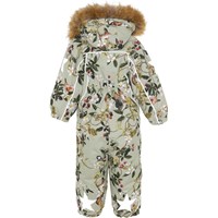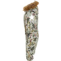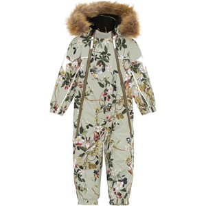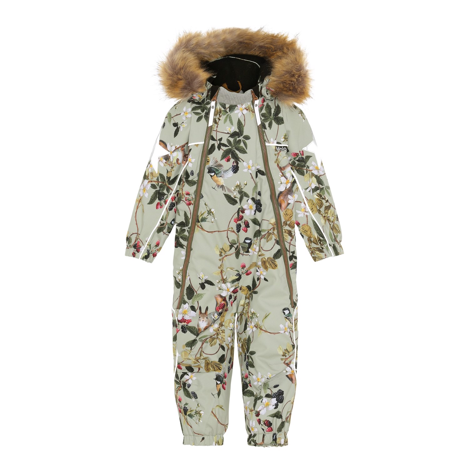 Pyxis er en funktionel flyverdragt til babyer og små børn i lysegrøn med print af bær og blomster. Pyxis er perfekt både til de ekstrem kolde og almindelige vintre, grundet dets utrolig høje åndbarhed samt isolering. Den høje åndbarhed er med til at hjælpe kropstemperaturen regulere sig og sørge for, at dit barn hverken bliver for kold eller varm. På varmere vinterdage kan barnet derfor nøjes med tynde lag under og på dage med voldsomme tocifrede minusgrader kan man supplere med et ekstra lag indenunder. Har du er stillesiddende barn vil Pyxis også være et oplagt valg. Flyverdragten har aftagelig hætte med flot faux fur pelskant, samt to skrå lynlåse på fronten, der gør det nemt at få dragten af og på, snefang i benåbning, gummistrop under foden og Molo's velkendte refleksstjerne på overarme og bag på benene. Flyverdragten er lavet i et vindtæt, vandtæt og åndbart materiale. Ydermaterialet er fremstillet af 45% genanvendt polyester, 3M™ Thinsulate™ foret er fremstillet af 83% genanvendt polyester og inderstoffet af 100% genanvendt nylon. Flyverdragten har desuden tapede sømme. Dette produkt har en vandafvisende PFC-fri imprægnering (indeholder f.eks. ikke PFOS, PFOA og lignende). Vandsøjletrykket og åndbarheden er yderligere forbedret og er nu helt oppe på 15.000 mm i vandsøjletryk og åndbarhed på 15.000 g/m2/24t.