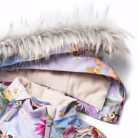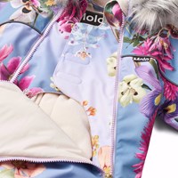 Flyverdragt til en kold vinter i genanvendt polyester, med et print af smukke blomster i friske farver med en bagrund i blå og lilla nuancer. Flyverdragten har en aftagelig hætte med fleece, to lynlåse med fleeceforet hagebeskytter for at undgå huden kommer i klemme. Flyverdragten har indvendig vindstolpe samt elastik i lænden, ved ærme- og ben afslutning, så sne, regn og vind holdes ude. Dragten er udstyret med refleksbånd langs sidesømmene, rundt om hætten, samt store stjerneformede reflekser på både ærmer og ben, som sikrer synlighed i trafikken. Dragten er foret med 3M™ Thinsulate™, hvis lethed giver barnet en større bevægelighed.