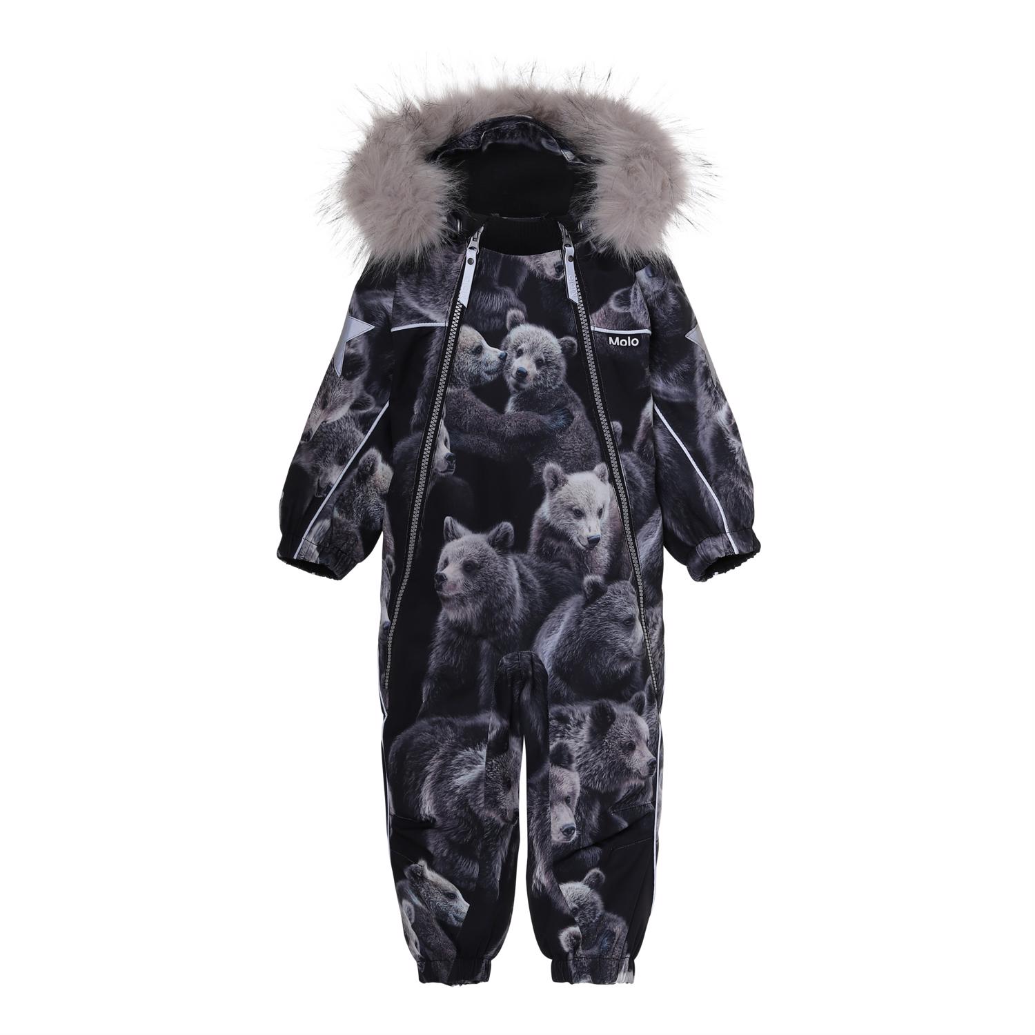 Pyxis er en funktionel flyverdragt til babyer og små børn med print af søde bjørne. Flyverdragten har aftagelig hætte med faux fur pelskant (som også kan tages af). Flyverdragten har to skrå lynlåse, der gør det nemt at få dragten af og på, snefang i benåbning, gummistrop under foden og Molo's velkendte refleksstjerne på overarme og bag på benene. Flyverdragten er lavet i et vindtæt, vandtæt og åndbart materiale, har 3M™ Thinsulate™ isolering, højkvalitetsfleece på udsatte områder og tapede sømme. Dette produkt har en vandafvisende PFC-fri imprægnering (indeholder f.eks. ikke PFOS, PFOA og lignende).Vandsøjletrykket og åndbarheden er yderligere forbedret og er nu helt oppe på 15.000 mm i vandsøjletryk og åndbarhed på 15.000 g/m2/24t.