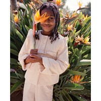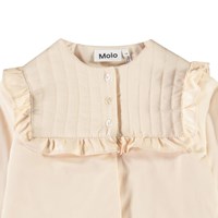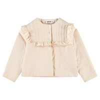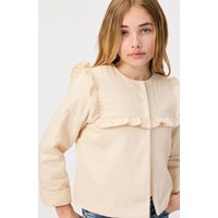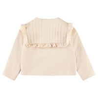 Beige vatteret jakke i blødt bomuld med flæsekant. Jakken har en almindelig pasform med et quiltet bærestykke der lukkes med tre perlemors knapper. Kombiner jakken med matchende bukser for et komplet sæt.