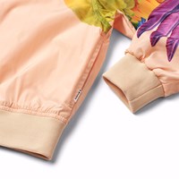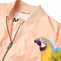 Koralfarvet, vandafvisende (PFC-fri: PFOS og PFOA) bomberjakke i genanvendt polyester med et farverigt print på ærmerne af papegøjer. Jakken har en normal pasform, lynlås lukning på fronten, ribkanter ved krave, hofte og ærmegab.