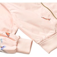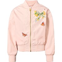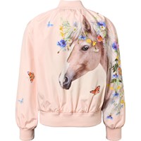 Lyserød vind og vandafvisende bomberjakke med et farverigt print af en hest og smukke sommerblomster. Jakken har ribkant ved hals, ærmer og talje, samt lynlås foran og quiltet foer, der gør den både blød og behagelig.