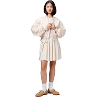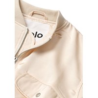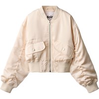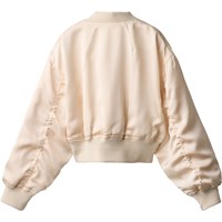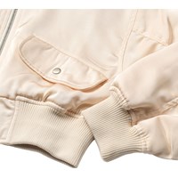 Råhvid kort bomberjakke med let glans og quiltet foer, der gør den lun og behagelig. Jakken har klassiske detaljer som rib ved hals, ærmer og talje, samt lynlås foran og store lommer med klap og trykknapper. En stilren jakke med plads til bevægelse.