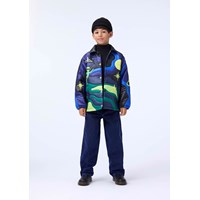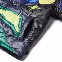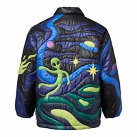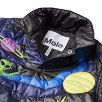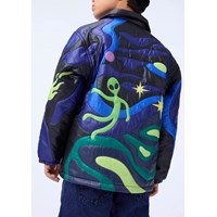 Sort quiltet jakke med space mønster og aliens i flotte farver. Jakken har en klassisk krave med sorte trykknapper, elastik omkring håndled samt en indevendig justerbar elastik i bunden. Jakken har en løs pasform, der gør det muligt at have en tyk trøje inden under og er god i overgangsperioderne.