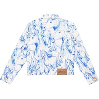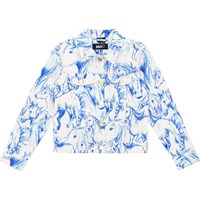 Hvid denimjakke i en kraftig bomuldsblanding med blåt alloverprint, som er baseret på håndtegnede skitser af heste. Jakken har en elegant skjortekrave, knaplukning, to brystlommer og forstærkede, lodrette prinsessesømme, der giver en tætsiddende pasform. Fra str. 92-134, leveres jakken med en praktisk, imiteret knaplukning med trykknapper, hvilket gør det lettere for børn at lukke jakken selv. fra str. 140-176, leveres jakken med traditionel knaplukning.