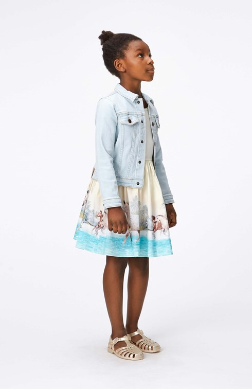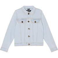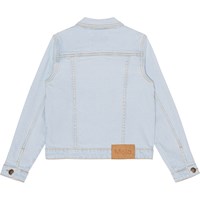 Lyseblå denimjakke med dekorative gule stikninger. Jakken har en elegant skjortekrave, knaplukning, to brystlommer og forstærkede, lodrette prinsessesømme, der giver en tætsiddende pasform. Fra str. 92-134, leveres jakken med en praktisk, imiteret knaplukning med trykknapper, hvilket gør det lettere for børn at lukke jakken selv. fra str. 140-176, leveres jakken med traditionel knaplukning.