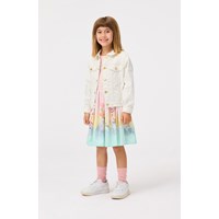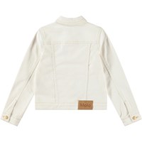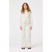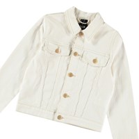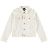 Hvid denimjakke med dekorative stikninger. Jakken har en tætsiddende pasform, skjortekrave, guld farvet knapper på fronten, lommer og ved håndleddene.